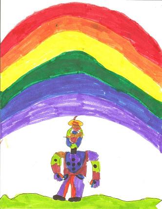 When he got to the park, the rain stopped. He saw some purple flowers and green grass. He heard children laughing and playing. He looked up and saw a rainbow. He jumped as high as he could and touched the colors of the rainbow. When he touched the rainbow he became colorful again.